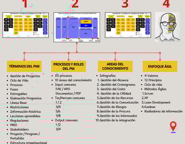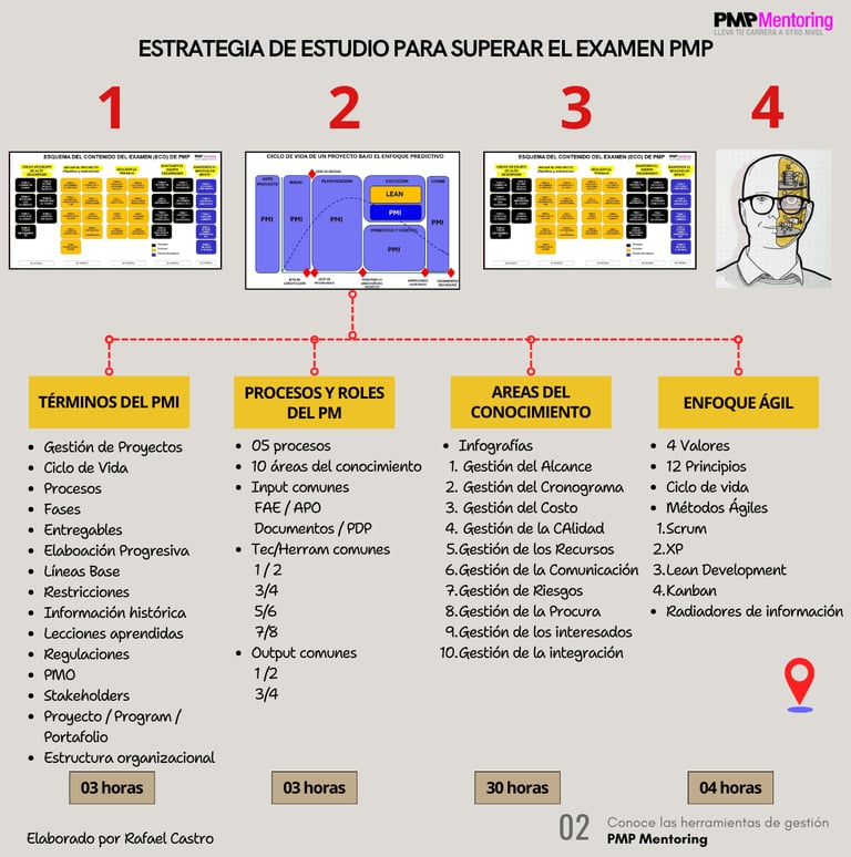 Nuestra estrategia está basada en infografías como un enfoque innovador y visual para comunicar de manera clara y concisa los conceptos esenciales en la preparación del examen PMP. Este método facilita la comprensión y retención de conceptos al: